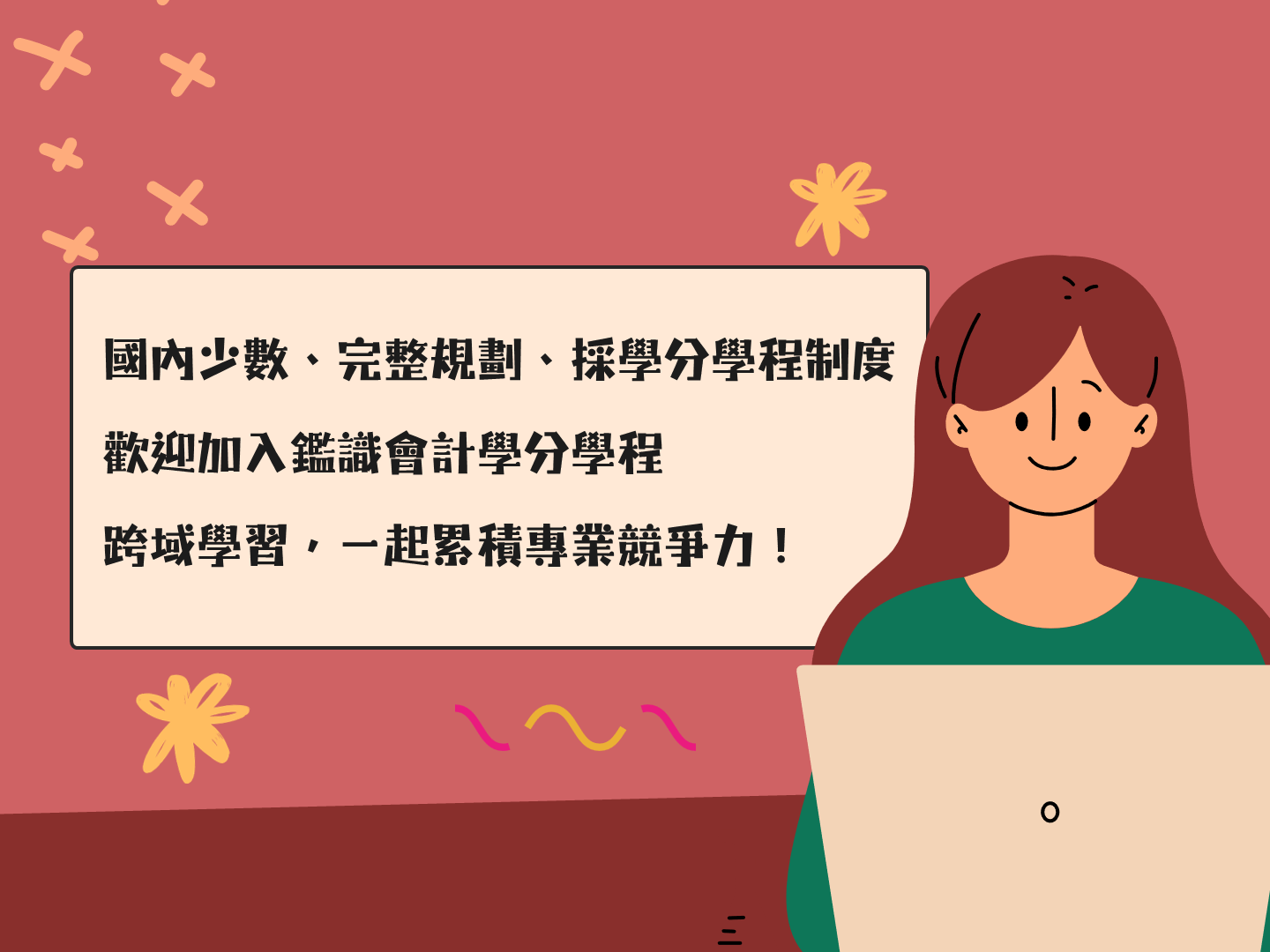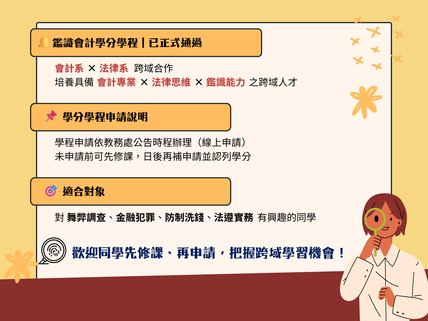 國內少數以學分學程制度規劃的鑑識會計跨域學程!歡迎對企業治理、舞弊調查、法律與會計交叉領域有興趣的同學,一起加入,累積未來職涯的專業競爭力。