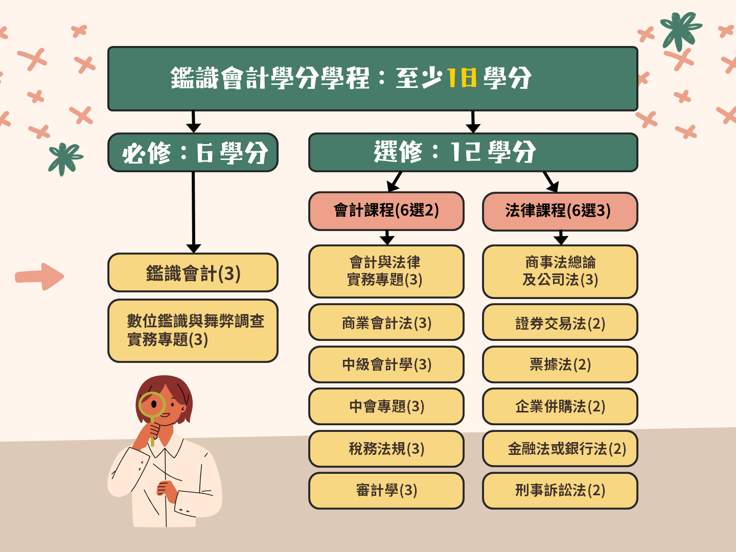 修業需完成 至少18學分(含必修6學分與選修12學分),並透過會計與法律雙軌課程,培養同學在舞弊調查、證據分析、企業治理與法律責任判讀等面向的能力。