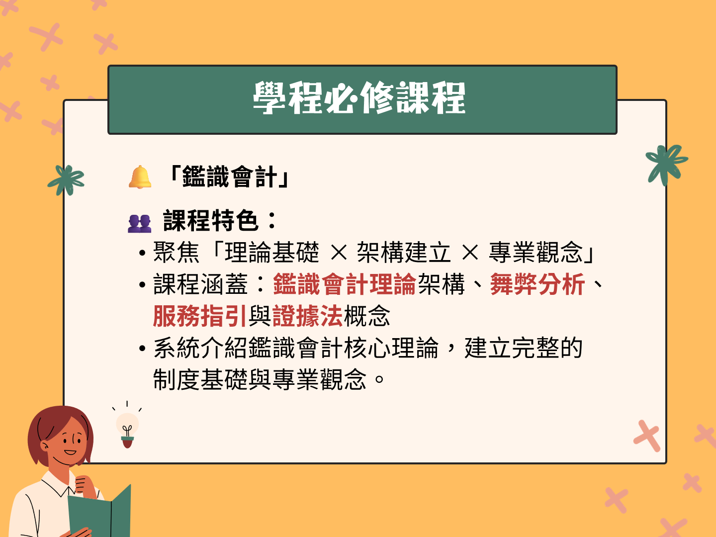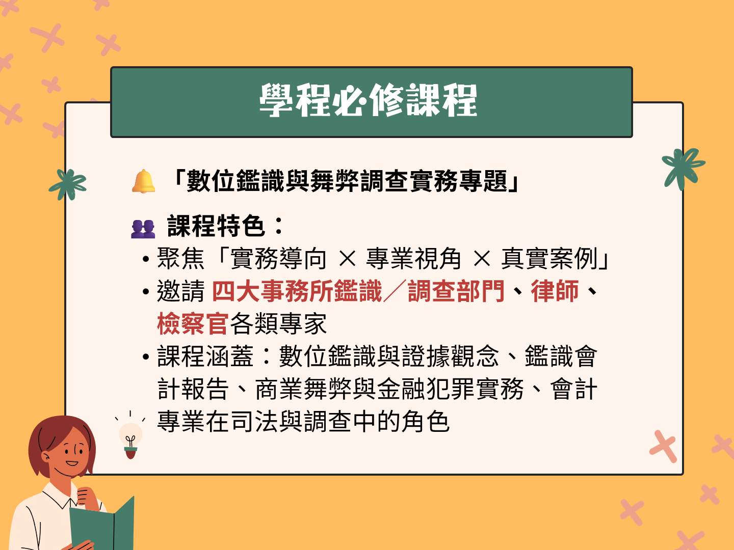 本學程採跨領域課程設計,結合會計與法律專業,課程涵蓋: